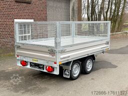 Hydraulics, automatic reverse drive, hot-dip galvanizing, roof window, grid attachment / hand pump / solid steel floor / cordless screwdriver pump, * IMMEDIATELY AVAILABLE * incl. grid attachment / hand pump / solid steel floor / cordless screwdriver pump Technical data: - Type: New vehicle - TÜV: New/2 years - Availability: IMMEDIATELY! - Gross vehicle weight: 2,000 kg - Unladen weight: 530 kg - Payload: 1,470 kg - Interior dimensions: 268 x 150 x 90 cm (L x W x H) - Overall exterior dimensions: 416 x 164 x 158 cm (L x W x H) - Loading sill height: 68 cm - Tyres: 155/80R13 steel rim - Brake: yes - Support wheel: yes, automatic - 100 km/h: at extra charge - incl. vehicle documents Vehicle superstructure: - incl. Vehicle documents Vehicle superstructure: - Floor: solid steel floor, solidly reinforced - Side walls: anodized aluminium double-walled, 4x folding & removable - Side wall height: 30cm - Chassis: high loader, ALKO rubber spring axle - Tipping function: yes, backwards - Hydraulics: hand pump & cordless screwdriver pump Tipping - Tipping angle: approx. 45 - Steps hydraulic cylinder: 3 steps - Overrun device & brake: ALKO - Frame/chassis: welded hot-dip galvanized steel frame - Attachment: with grid attachment 60cm - Lashing eyes: 6 pieces in the floor (800kg/daN) - Supports: at extra cost - Ramps: at extra cost Standard equipment: - Anodized double-walled aluminium drop sides - Drop sides can be folded to the side and rear - Removable drop sides - Full steel floor - Extremely robust - Very sturdy welded steel frame - Frame completely hot-dip galvanized - Many options available hot-dip galvanized - many sturdy cross beams for high point loading - additional longitudinal struts welded in throughout - hand pump for manual tipping - lashing hooks welded to the bottom of the frame - automatic reverse drive - ALKO overrun device and parking brake - sturdy tension locks - very sturdy V-drawbar REINFORCED - 13-pin plug - reversing lights - large reversing lights plug - reversing lights - large safety lighting - integrated rear fog light - lighting recessed in rear frame - automatic center support wheel - registration papers: ZBII and COC papers Optional equipment included in the price: - FLEXePUMP (tipping with cordless screwdriver) - Hand pump and cordless screwdriver pump in one - Corrugated grille attachment 60cm Accessories can be retrofitted - please enquire: - 100km/h approval with shock absorbers - side wall attachment - sheet metal attachment closed 60cm - spare wheel - storage box - rear supports - ramps - flat tarpaulin - net hooks - additional lashing eyes - slotted-hole rails for tension belts & locking beams - bar strip with rubber coating for tension belts & locking beams - reversing lights - lashing straps - and much more. New vehicle with warranty and TÜV. We are happy to offer you suitable financing !, Descriptions and pictures are protected by copyright !!! Over 800 trailers immediately available for you! We are for over 30 years Brian James / Humbaur / Hapert / Unsinn / Cheval Liberte / Koch / Debon / Stedele / TPV / Tohaco / Vezeko / Variant / Vlemmix - specialized dealer & repair - workshop - delivery Germany-wide with surcharge possible! Anhänger Zentrum BAUMANN GmbH Dinxperloer Str. 389 46399 Bocholt - Errors, omissions and prior sale excepted -