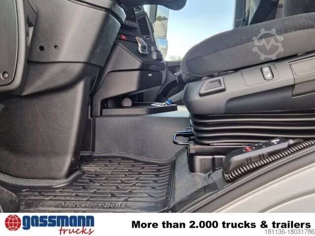 Superstructure: Body length approx. 7,150 mm, frame height approx. 970 mm, 68 t. Front axle air-suspended, 8 t front axle, 13 t rear axle (hypoid gear, crown wheel 485), 7.5 t trailing axle unloadable/liftable. Electronic braking system with ABS and ASR, disc brakes on front and rear axles, electronic parking brake, condensate monitoring for the compressed air system, trailer stability assist (TSA), secondary oil retarder, additional stabiliser rear/trailing axle, axle load measuring system, aluminium front underrun protection, residual heat utilisation, ClassicSpace, comfort locking system, light sensor, rain sensor, Mercedes PowerShift 3, economy/power drive mode, navigation system, Multimedia Cockpit Interactive, Remote Online, digital radio, pre-installation for toll collection device, tank capacity: 500l, LED headlights, LED daytime running lights, high performance engine brake, headlight cleaning system, automatic high/low beam, hill start assist, Safety Pack, Sight Package, Economy Package, smoker package, ESP, roll stability control, lane keeping assist, traffic sign recognition assistant, Active Brake Assist 5, distance control assistant, attention assist, Active Sideguard Assist, seat belt monitoring, driver airbag, refrigerator. 68 t.